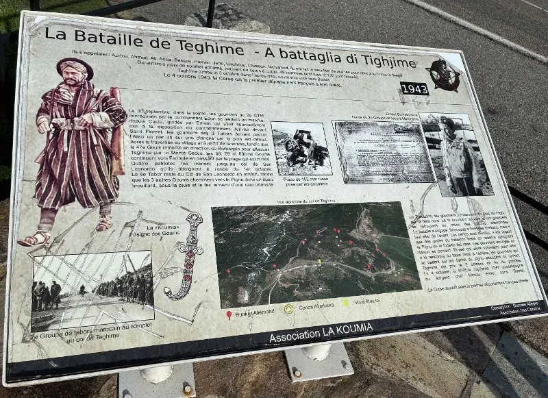Mais ici, l’objet endommagé relate les combats du 3 octobre 1943 contre les troupes nazies et au cours desquels s’illustrera particulièrement le 2e GTM (les ‘goumiers’), protagoniste de la libération de l’île. Cette bataille de Teghime appartient donc intimement à l’Histoire de la Corse, à notre histoire.