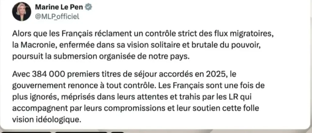 avec une hausse de 11 % des titres de séjour accordés, l’immigration est « hors de contrôle ».”Records de titres de séjour, bascule démographique, jurisprudence toujours plus permissive : la France subit une immigration de masse qu’aucun pouvoir n’ose réguler. Il accuse la gauche d’avoir transformé l’impuissance en système.