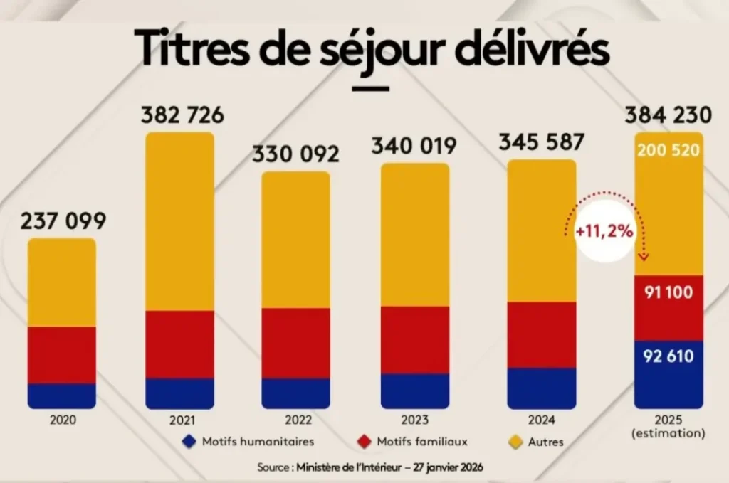 384 000 premiers titres de séjour ont été délivrés en 2025, soit une hausse de 11,2% par rapport à 2024.